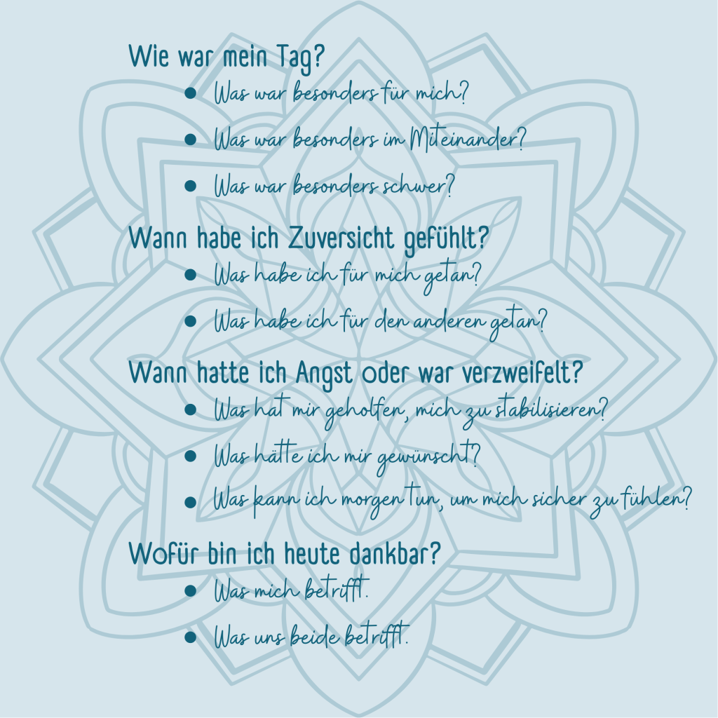 Daher haben wir ein Tagebuch extra für Angehörige entwickelt. Hier geht es vor allem darum, damit zu beginnen, diesem Tagebuch ihre Gedanken und Ängste anzuvertrauen, um die Seele zu entlasten. Ganz nebenbei bietet dieses Tagebuch Anregungen für Reflexionen, die helfen können, mit dem Schreiben zu beginnen.